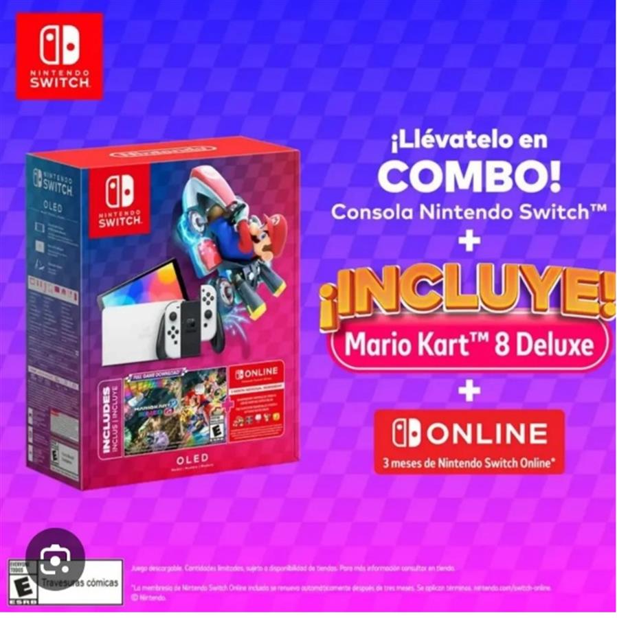 ¡Prepárate para la carrera de tu vida con el bundle de la Consola Nintendo Switch – OLED y el aclamado Mario Kart 8 Deluxe! Este pack es el punto de partida perfecto para sumergirte en la versatilidad del gaming de Nintendo. Juega en la espectacular pantalla OLED de 7 pulgadas, que ofrece colores vibrantes y contrastes nítidos para una experiencia visual superior, ya sea en casa o en movimiento. \n\nCon 64GB de almacenamiento interno, tendrás espacio suficiente para tus juegos favoritos, y siempre podrás ampliarlo con una tarjeta microSD. El bundle incluye un código de descarga para el juego completo Mario Kart 8 Deluxe, permitiéndote unirte a las emocionantes carreras con personajes icónicos desde el primer momento. Además, para que la diversión no pare, se incluye una membresía individual de 12 meses de Nintendo Switch Online, dándote acceso al juego online, una biblioteca de juegos clásicos de NES, Super NES y Game Boy, y más beneficios. \n\nLa consola es tan versátil como tú: juega en modo TV con el dock incluido, en modo portátil en cualquier lugar, o en modo semiportátil usando el soporte ancho para compartir la pantalla con un amigo. Los dos Joy-Con blancos incluidos te permiten jugar de inmediato, pasándole uno a un amigo para una carrera improvisada. ¡Diversión sin límites en un solo paquete!